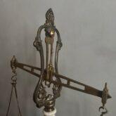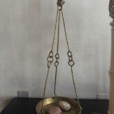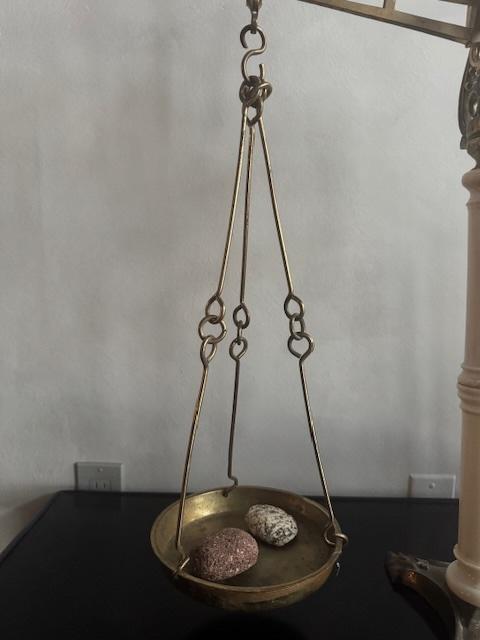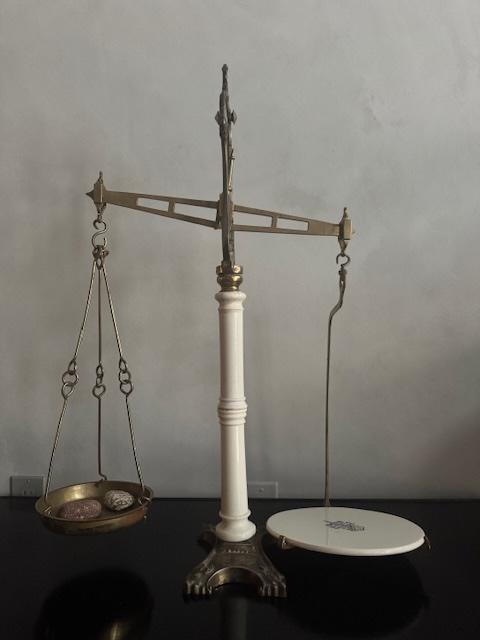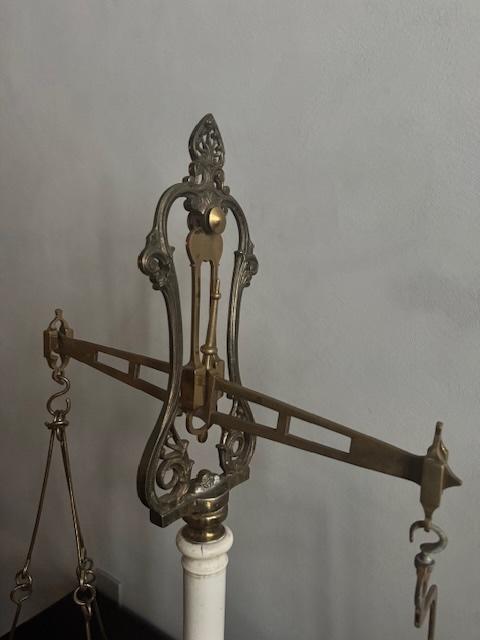 Antique 19th Century Victorian scale with case iron base, stoneware plate and column and brass details. Typically used in grocery stores during the 19th century.